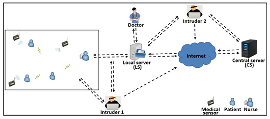 Many attacks undermine the security of the WSN of collecting patients’ data and threaten the privacy of the EMR repository. These attacks have been classified into passive, active, internal, and external attacks [12,13,14]. For instance, potential attacks on data transferred or stored in an EMR repository by WSN are a serious risk to HC systems. As shown in Figure 1, Intruder 1 can listen to data as they are transferred from the patients’ sensors or s to the server (/). When the attacker intercepts the message, he/she can obtain information about the physical location of the patient, ID, timestamps, source address, target address, and the medical report sent by the sensors or directed by medical staff devices. The patients’ data transmitted through the sensor networks requires complete security, especially when movement through the network does not require the consent of the patient, such as moving the data of an emergency case [15]. Additionally, Intruder 2 can perform an attack on the /remote Central Server () to penetrate the datasets to obtain patient information. An attacker can also get information from the datasets, such as the patient’s name, age, address, type of disease, and the seriousness of the disease. This information allows the attacker to harm the patient in different ways, such as changing or destroying data [16]. However, designing a patients’ data collection scheme with strong and heavy signing mechanisms without regard to network performance in data collection is useless and infeasible for HWSN systems. Therefore, performance and security issues are essential to provide care services in HC applications.