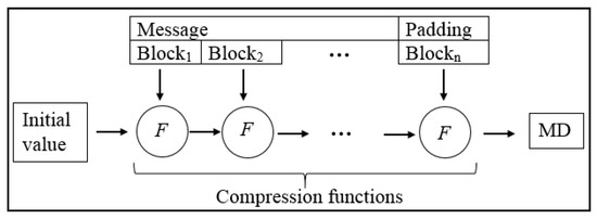 Figure 2. The Merkle–Damgard construction of SHA (0, 1 and 2) hash functions.SHA is a one-way function consisting of two phases that divide the message into blocks of the same size (such as 512 or 1024). A set of zeros is added and followed by one at the end of the last block of the message [18]. This phase is called preprocessing or padding. The second stage is the MD computation. At this stage, all message blocks are entered into the iterations (SHA1 (80), SHA2 (64), and SHA3 (256)) one by one, containing constants and logic operations (OR, AND, and XOR) in the compression function (F) to produce MD. Each hash algorithm produces a fixed length of MD such as 160 for SHA1 and 224, 256, 384, and 512 for SHA2 and SHA3 [50]. Table 1 shows the comparison between SHA1, SHA2, and SHA3 [51]. Many existing schemes to collect data in WSN [18,52,53,54] have used the SHA algorithm to support integrity and authentication. However, these schemes do not address the collision and preimage problems in the SHA algorithm [31,32,33,34,35].