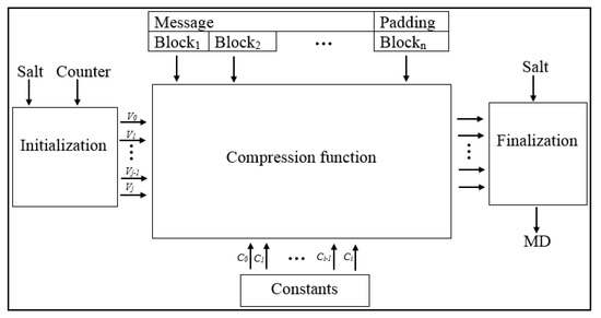 Table 2. Versions of BLAKE hash function.Figure 3 shows the architecture of the BLAKE hash function. In BLAKE, the message is divided into blocks, and the last block is padded with 1 followed by zeros to complete the last block size to 512 or 1024 bits. BLAKE consists of two parts: the compression function and iteration mode. The compression function consists of chain value, message blocks, salt value, and counter value. The BLAKE compression function uses three phases: initialization, round functions, and finalization. The initialization phase uses the chain value, salt, and counter to create a 4 × 4 matrix, and produces a 16-word value for different initializing states (V). These states are entered into the round function (r) with parallel rounds in the phase of the round functions. The output of this phase is a new V that is used to generate the chain value for the finalization phase. In the finalization phase of the chain, salt and new state values are applied with ⊕ operations to produce a new chain value. BLAKE is one of the fastest hash algorithms and has strong security [50,58]. Recent research has pointed out that BLAKE is a suitable algorithm for source limited devices [59,60].