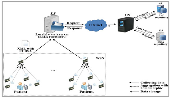 Among the WSNs, the low-energy adaptive clustering hierarchy (LEACH) protocol is used. LEACH uses clustering architecture to improve the WSN lifetime. More details about this protocol are available in [70]. Each group of s collects raw data for a specific patient [71]. These s sign data before sending them to s. Each aggregates data and signatures from his followers. Then, each uses homomorphic property with all data and signatures without verifying the signatures to reduce energy consumption on the and send them to the . As the has unlimited resources, it verifies and validates collected data from s. The sends data stored on the EMR’s repository to the central repository to allow HC users (patients and providers) to access them by sending authentication/authorization requests to the , , and . This paper focuses on performance and security issues in s, s, , and . Security issues for datasets and transferred data in , , and are left for future works.
