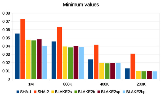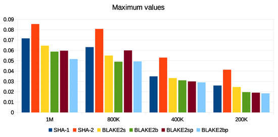- BLAKE familyAumasson et al. [55] proposed a BLAKE hash algorithm to overcome the efficiency problems in previous hash algorithms. This algorithm offers several features such as simplicity, speed, and parallel operations in hardware and software implementations. It is immune to second preimage, side-channel and length-extension attacks. BLAKE implements HAIFA construction which is an enhanced version of Merkle–Damgård. This development of construction is accomplished by adding a salt and a counter to the algorithm stages to prevent security vulnerability for second preimage attacks in Merkle–Damgård. BLAKE’s local wide-pipe structure also makes collision attacks impossible [47]. BLAKE uses the LAKE hash algorithm and compresses the message blocks in hash-tree constructions with Bernstein’s stream cipher ChaCha, which is a variation of Salsa20-256. Skein and Grøstl [56] considered NIST, a BLAKE of competing algorithms, in the final round of hash algorithms such as KECCAK. BLAKE supports several versions: 244, 256, 384, and 512. Subsequently, Aumasson et al. [57] developed BLAKE2 to improve the speed in software implementation and to reduce memory. BLAKE2 has 32% less memory than BLAKE. In addition, BLAKE2 contains two versions, BLAKE2s and BLAKE2b, to be used with 32-bit and 64-bit platforms, respectively. Moreover, the authors developed the latest versions, BLAKE2bp and BLAKE2sp, to improve the speed of MD production during parallel processes. Table 2 shows the BLAKE family [50].