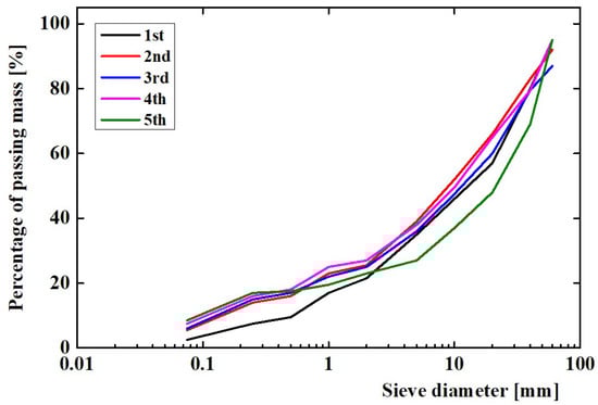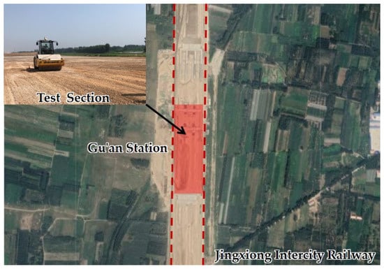 This paper took the Jingxiong Intercity Railway Gu’an Station with a large number of subgrade compaction work as the test section, and the planed test site is 200 m in length and 100 m in width, as shown in Figure 1. The filling part is the embankment part below the subgrade bed surface, which is divided into 19 layers. The thickness of each layer is controlled at about 30 cm. The coarse breccia of groups A and B with a dry density of 2.3 g/m3 and an optimal moisture content of 5.2% was used to fill subgrade, and its particle grading curve is shown in Figure 2.