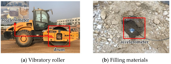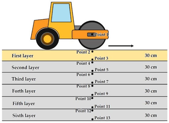 In order to collect the vibration signals during the compaction process, the measurement points are, respectively, arranged on the vibratory roller and different filling layers. As shown in Figure 4, one measurement point was arranged on the vibration wheel, and 12 measurement points were arranged on filling materials. The measuring points in filling materials were arranged on the upper and lower surfaces of each layer to monitor the transmission of the vibration signals at the interface. All filling layers were compacted except for the first layer. Based on a large number of compaction work in the early stage, the weak vibration mode of vibratory roller was more conducive to the compaction of this filling material. Consequently, when filling materials of the first layer are flattened and statically pressed, eight times compaction is carried out by means of weak vibration mode. Lightweight deflectometer (LWD) is used to measure the properties of filling material after each compaction [40].