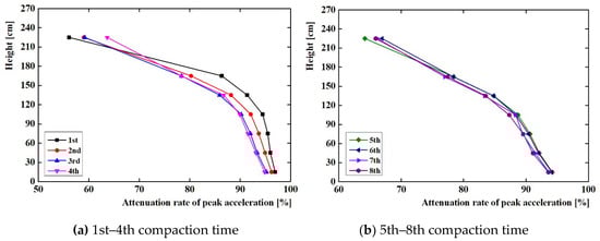 According to Figure 7, it can be found that the peak attenuation rate of acceleration is the largest when the vibration signal is transmitted from the wheel to the surface of filling materials. With the increase of compaction times, the attenuation rate increases from 51% to 66%. As the stiffness of the filling materials increases, the vibration signal has to consume more energy for transmission to the filling layer. The transmission mechanism of the vibration signal from the shallow filling layer to the deep filling layer is the opposite. As the filler enters the dense state from the loose state, the stiffness between different layers gradually decreases so that the peak attenuation rate of the vibration signal also gradually decreases. The attenuation rate of the vibration signal transmitted to the fourth layer (1.2 m) is more than 90%. It can be seen that the critical depth of the vibration acceleration in the filling layer is about 1.2 m.