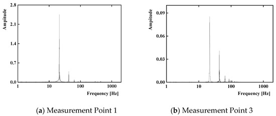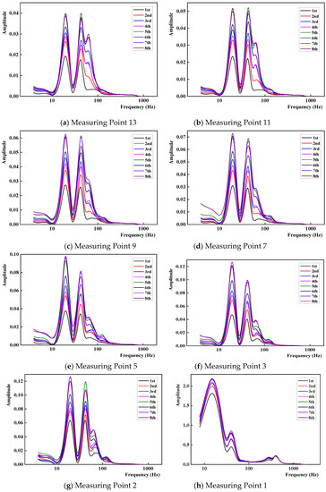 The variation of the vibration signal spectrum is related to the stiffness of the filling materials under compaction [42,43]. Thus, the Fast Fourier Transform (FFT) was used to decompose the vibration signal into the frequency domain in order to analyze the frequency information, as shown in Figure 8. It can be seen that the frequency and amplitude of the fundamental wave and multiple harmonic waves appear in the acceleration of each measuring point. The fundamental wave frequency of the vibration acceleration is basically stable near 21 Hz during the compaction process, and the fundamental wave frequency increases slightly from the vibration wheel to the filler surface, maintaining stability in each filling layer.