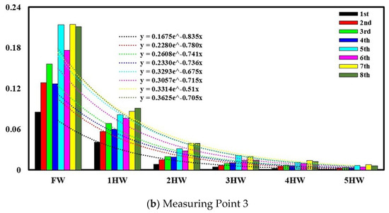 Figure 9 shows the variation of fundamental and multiple harmonic amplitudes of each measuring point in the compaction process. When the vibration signal propagates from the vibration wheel to the deep layer, the ratio of fundamental amplitude to total amplitude decreases with the increase of buried depth. With the increase of buried depth, the amplitude of fundamental, primary, secondary, until fifth harmonics decreases exponentially, and the attenuation models are shown in Figure 9. The concrete functional relationship among different amplitudes of harmonics can be summarized as shown: y = Ae−BX. In the formula, A and B represent the coefficient, X represents the order of harmonic and Y represents the amplitude of harmonic when its order is X.