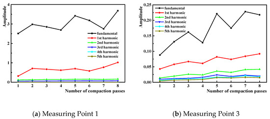 Figure 10 shows the relationship between the amplitude of harmonic and rolling compaction times, which shows that with the increase of compactions passes, the amplitudes of the fundamental wave and the multiple harmonic waves generally show a trend of “increase → decrease→ increase”, and the decrease of amplitude occurs in the sixth pass compaction process.