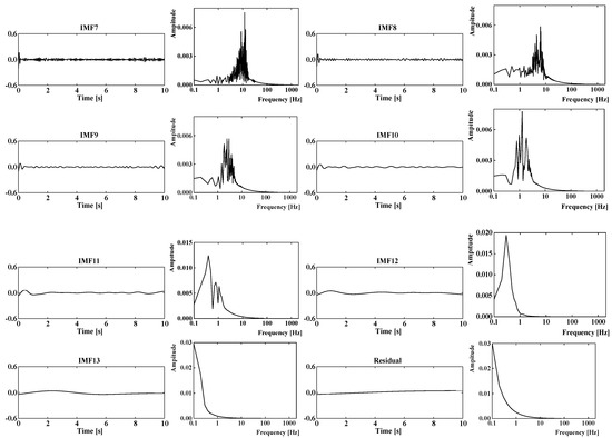 Taking the acceleration of the first compaction vibrating wheel (Measuring Point 1) as an example, the original vibration signal is decomposed by EMD to obtain each IMF component, as shown in Figure 10. Fourier transform is used to obtain the spectrum curve of each IMF component, as shown in Figure 11. From Figure 10 and Figure 11, the original vibration signal of the wheel is decomposed into 13 IMF components and one residual component, and each IMF component has a different amplitude and frequency component. Among each IMF component, the waveform of IMF6 is consistent with that of original signal, and its dominant frequency and amplitude are substantially consistent with that of the original signal; IMF5 mainly contains the same frequency as the fundamental wave, first a harmonic wave and second harmonic wave, but its dominant frequency and amplitude are the closest to the first harmonic. The three frequencies with the largest amplitude of IMF4 are basically consistent with the frequencies and amplitudes of second, third and fourth harmonic waves of the original vibration signal, and the remaining components are high-frequency or low-frequency interference signals. Therefore, the waveform of the wheel is composed of IMF6, IMF5 and IMF4. To some extent, EMD can identify the fundamental and harmonic components of vibration signals, and remove the mechanical and environmental noise interference.