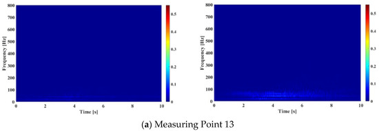 Based on the results of EMD, the energy spectrum is obtained by Hilbert transform, and the evolution characteristics of the vibration signal energy in the time–frequency domain are represented by a two-dimensional plane contour map, and Figure 12 is the Hilbert energy spectrum of each measuring point in the first pass and the eighth pass. According to the comprehensive analysis of Figure 12, it can be found that the evolution characteristics of the vibration signal can be better described by the Hilbert–Huang transform, and the vibration energy carried by the vibration wave from top to bottom is gradually reduced. During the first pass compaction process, the vibration energy of the wheel varies little from T = 0 s to T = 10.0 s, mainly distributed between the fundamental wave frequency of 20 and 30 Hz, and a small amount is distributed between 40 and 50 Hz of the first harmonic wave frequency. The energy carried by each measuring point of the filling layer is concentrated between T = 2 s and T = 3 s when filling materials are loose, and also distributed near the frequency corresponding to the fundamental wave and the first harmonic in the frequency domain. With the increase of compaction times, the density of filling material increases, the vibration energy of the wheel and each measuring point of filling material increases obviously, and the action time increases from 1s to 2s, but the distribution in the frequency domain does not change much, which shows that the effective rolling time of the vibrating roller increases gradually during the compaction process of the filling material.