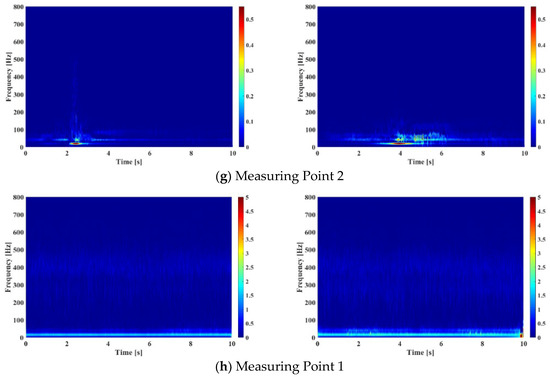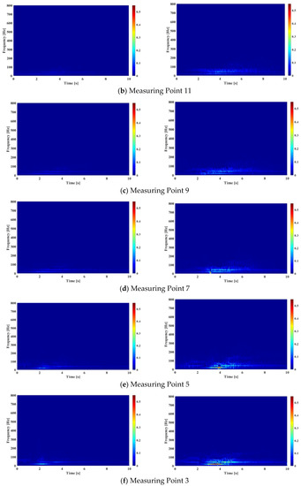 Hilbert energy spectrum of each measuring point in the first pass (left) and the eighth pass (right).