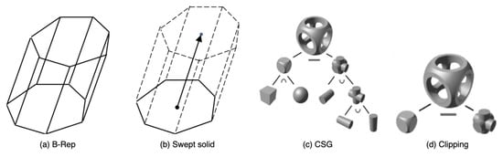 Basic representation methods used in IFC. (a) Boundary representation (B-Rep); (b) swept Solid; (c) constructive solid geometry (CSG) []; and (d) clipping.