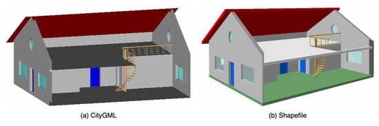 In general, there are two approaches for BIM data to be converted to GIS, including IFC-to-CityGML conversion and IFC-to-Shapefile conversion. IFC-to-CityGML conversion mainly utilizes semantic-based methods to transfer semantic information between IFC and CityGML by creating intermediate data models (ontologies) between IFC and CityGML []. IFC-to-Shapefile conversion is mainly used by studies that are focusing on the integrated application of BIM and GIS to solve practical problems []. The IFC-to-CityGML conversion faces more challenges and the challenges are even more severe as compared with IFC-to-Shapefile conversion. Apart from the common geometry conversion problems, two extra problems confronting IFC-to-CityGML conversion include mapping of level of details (LoDs) and converting solid models to surface models as follows: (1) CityGML has defined five LoDs from LoD0 to LoD4 [] and BIMForum also defined five levels of development (LOD) for BIM []. Unfortunately, LoDs and LODs cannot be simplified and mapped in a one-to-one manner. (2) Conversion from solid models to surface models has to be properly completed. For example, a wall represented by swept solid in IFC has to be represented by two pieces of individual surfaces in CityGML, one for interior wall and the other for exterior wall. Such a conversion is more challenging than the conversion between solid models such as IFC-to-Shapefile conversion. The difference between a surface model and a solid model is shown in Figure 2, using a house model. In addition, the degree of challenge increases dramatically when converting IFC to higher CityGML LoDs. By far, IFC models can be automatically converted to valid LoD3 models [].