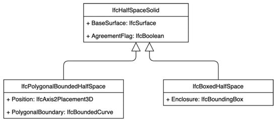 Parameters for the main body include sweeping profile, sweeping direction, and sweeping depth; parameters for unbounded half space include a base surface (defined by a normal direction and a point on the surface) and an agreement flag (a Boolean value, either true or false). Since bounded half space () is a subclass of unbounded half space (), apart from the base surface and the agreement flag, it additionally includes two more parameters, including position and the polygonal boundary. The parameters for each type of half space are presented in Figure 4, which represents the relationship between unbounded half space and bounded half space using unified modeling language (UML) [].