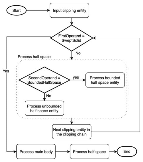 The primary challenge in parameter extraction is to identify all the second operands (half spaces) and the first operand of the last clipping (the main body) from the cascading system. The following algorithm was developed to solve this problem (see Figure 5), and the pseudocode for this algorithm is given in Appendix A. This algorithm was used to process both multi-clipping entities and one-clipping entities.