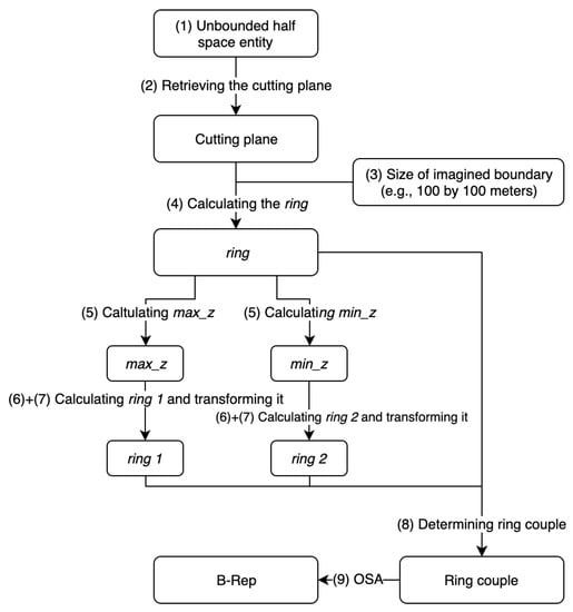 The detailed steps for the proposed method of instantiating unbounded half space entities are presented Figure 6 as follows: (1) Retrieving the unbounded half space entity; (2) retrieving the cutting plane, including its normal direction, a point on it, and the agreement flag; (3) defining the size of the imagined boundary for unbounded half space, for example, 100 by 100 m; (4) getting the closed ring, , formed by the intersections of the cutting plane and lines that pass through vertices of the boundary and are perpendicular to the x-y plane; (5) obtaining the maximum and minimum value of the z-value, i.e., and , of the (6) generating another two closed rings, i.e., and . , with a z-value of (, is parallel to the x-y plane; , with a z-value of (, is also parallel to the x-y plane. is the length of a buffer that is created to make the B-Rep sufficiently large in the z-axis direction; (7) transforming the coordinates of all rings to the world coordinate system used by the IFC project; (8) determining the ring couple, i.e., (, ) or (, ) to be used to regenerate B-Rep, depending on the value of ; (9) generating B-Rep using OSA. This strategy can also be applied to convert bounded half space entities, all steps remain the same, except Step 3 where the boundary size is exactly retrieved from IFC. Please note that it is important to ensure that the converted B-Reps are closed, since only closed B-Reps can be used in geometry operation [].