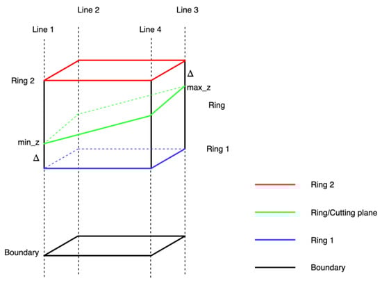 Figure 7 provides an illustration of the imagined boundary for unbounded half space, as well as , , , and cutting plane. Four lines, from Line 1 to Line 4, are perpendicular to the x-y plane and go through the four corners of the imagined rectangular boundary, respectively. There are four intersections between these four lines and the cutting plane, which then form the . The maximum and minimum value of the z-value of these intersections are and , respectively. The coordinates for and can be obtained by adding or subtracting a length of buffer, which are and , respectively.