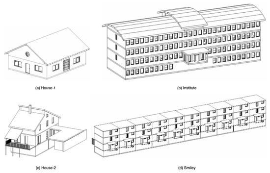 Several BIM models were used in this study, including two house models and two building models. Figure 8 presents these models, which include (a) House-1, (b) Institute, (c) House-2, and (d) Smiley. House-1, Institute, and Smiley were acquired from Karlsruhe Institute of Technology (KIT), which could be used unrestrictedly [], while House-2 was acquired from Open IFC Model Repository []. House-1, Institute, and Smiley were used to measure the size of building components to determine the size of boundary and the buffer. House-2 was not used for this purpose as it failed to contain bounding box for each building part. During the validation of the proposed automatic conversion process, the Smiley model was not used because clipping was not used.