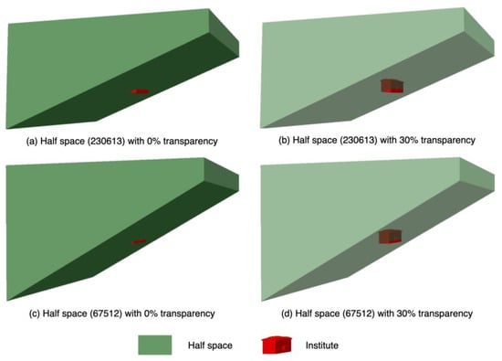 Examples of half spaces. (a) Half space (230613) with 0% transparency; (b) half space (230613) with 30% transparency; (c) half space (67512) with 0% transparency; and (d) half space (67512) with 30% transparency.