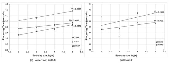 For building components from House-1 and Institute, there is a clear increasing trend in the processing time as the boundary size grows. The relationship between processing time and boundary size for these entities can be described using a linear equation, and high correlation coefficients have been noticed, around 0.98, as shown in Figure 12a. However, the increment in processing time is not very significant between neighboring boundary sizes. For example, consider the entity with ID 67536 from House-1 model, the total processing time increases to 3.76 s at the largest tested boundary size from 3.56 s at the smallest tested boundary size, with an increase of only 0.2 s, or 5.6%.