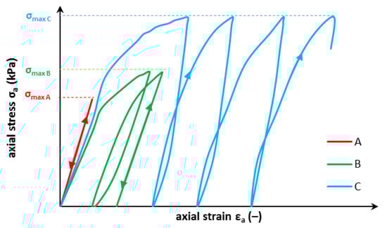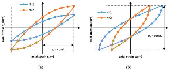 During the soil’s repeated loading, the hysteresis loop phenomena occur. Hysteresis loop shape depends on the stress level as well as on the physical parameters of the soil. Cyclic loading causes changes in the soil structure and, consequently, their properties. The analysis of the soil stress–strain response to cyclic loading will result in the hardening or softening process. The soil will experience cyclic hardening at most of the cyclic stress levels, despite the stress level being near to the failure point where the sample fails after a few cycles [41,42,43]. In other cases, the soil will decrease its strain amplitude in stress-controlled tests or increase its stress amplitude in strain-controlled trials. This relationship is depicted Figure 2.