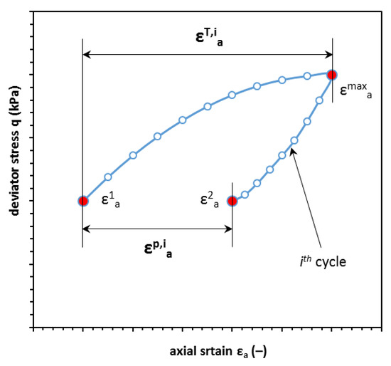 The Simple Hysteresis Loop Model (SHLM) is an empirical model created as a result of analyzing stress–strain plots. It utilizes the simple dependence of plastic strain abation [42] during repeated loading performed in constant stress conditions. The constant-stress loading is more suitable to describe what might be imposed on the soil subbase in comparison to the constant-strain loading conditions. To describe the plastic strain abation phenomena, we established the abation parameter Ax. The abation parameter can be defined as the quotient of plastic strain in i cycle to the strain achieved at maximal deviator stress in i cycle in Equation (13):