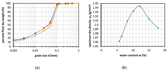 Soil samples were taken at the 1.5-m deep excavation of road construction sites in Warsaw. The soil was dried out and then ground into powder. We tested the soil to establish basic physical properties. The sieve and aerometric analysis led us to recognize this type of soil as sandy silty clay (sasiCl) or CL, according to the Unified Soil Classification System (USCS-ASTM D2487-11). In Figure 5a, the results of the granulometric study are presented. The result of the Proctor method test is shown in Figure 5b. The liquid limit obtained from the Casagrande apparatus was WL = 25.3%, and the plasticity limit was equal to WP = 12.8%. The plasticity index IP is equal to 12.5%. The soil has a pale brown color, and this type of soil in the natural state has low to medium undrained strength cu in the range of 20 to 60 kPa [43,45]. We tested the CaCO3 content with the use of 20% solution of HCl, the results of the test show that the soil has from 3% to 5% of CaCO3.