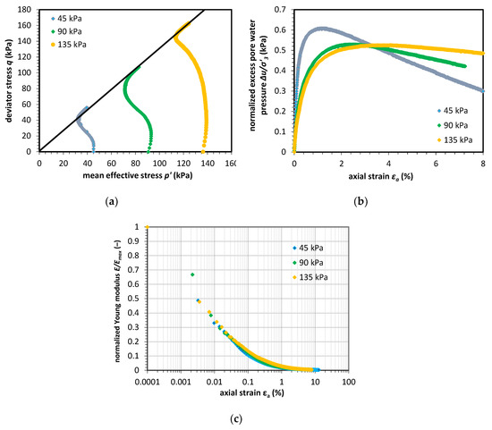 Results of the static triaxial tests on silty sandy clay samples, stress paths (a), normalized pore water pressure characteristics (b), and normalized Young modulus characteristics (c).