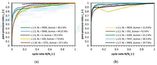 The pore pressure generation has the same characteristics, but Δumax is achieved in different cycles. The samples which generate their pore pressure over the longest time indicate slightly different behavior to other samples. The pore pressure generated in these samples to the ru is equal to around 0.9 in the first 1000 cycles and then increases in further cycles to 1.0. We can observe this behavior in tests, giving 1.1, 1.4, 1.5, and 1.7. The impact of Δumax on the number of cycles needed to reach the maximal pore pressure indicates that the higher the pore pressure that builds up, the greater the number of cycles needed to reach Δumax.