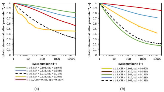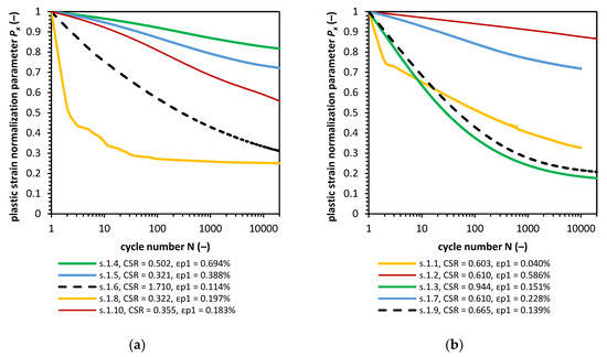 The deformability of the samples can be quantified by analysis of the strain development in comparison to the deformation in the first cycle. In other words, we represent the deformability as a plastic strain normalization parameter Px (14). The concept of this quotient was previously developed by Idriss et al. [48] as a concept of the degradation index δ which is represented as Equation (19):