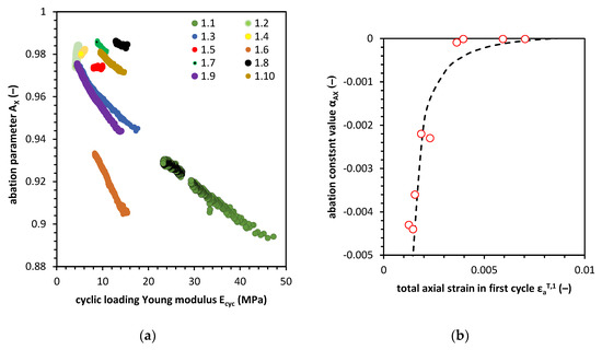 where is a strain at the beginning of the cycle, is a strain at the end of the loading–unloading procedure, and is a strain at maximal stress during one cycle. Figure 4 presents the dependencies mentioned above. The ablation parameter Ax will have a value between 0 and 1when the abation parameter is equal to zero, meaning that the strain which occurred during one cycle was fully recovered, and the material behaved as elastic. When the Ax is equal to 1, the strain during the cyclic loading was fully plastic in such stress conditions.