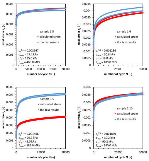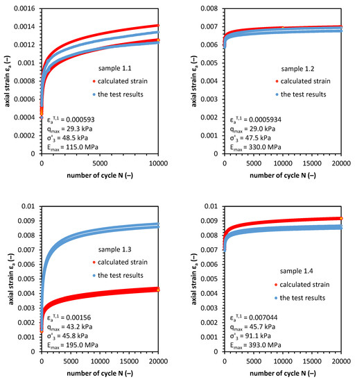 The structures are subjected to repeating loads due to working machines or traffic load, which causes various types of stress in subgrades [1,2,3,4]. The problem of repeating loading has been studied in recent years [5,6,7,8,9,10,11]. The reason for such interest is engineering problems, especially in pavement engineering. The development of pavement infrastructure forces engineers to design pavement construction over soft soils. As a result, the pavements, as well as the foundations, suffer extensive settlement. The uneven subsidence creates discomfort and often may be a cause of dangerous situations to the road users [12,13,14]. The studies led to establishing that the stability of structures under cyclic loads, when compared to monotonic loads, occurs in another manner. To design a cost-effective pavement structure or foundation and to avoid excessive settlement, it is desirable to predict the deformation of the subbase under repeating loading.
