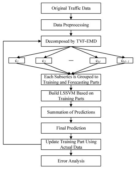 Based on the above discussions, a novel hybrid model which combines the TVF-EMD model and LSSVM model can be developed to improve the forecasting accuracy. First, the TVF-EMD method is presented to deal with the non-stationary and nonlinear traffic volume series. After that, multiple subsequences called narrow-band signals are obtained. Then, the LSSVM model is established for each subsequence. Finally, the prediction results of the subsequences are accumulated to generate the lasted forecasting results. The specific process of TVF-EMD-LSSVM model is shown in Figure 1, and the steps are shown as follows: