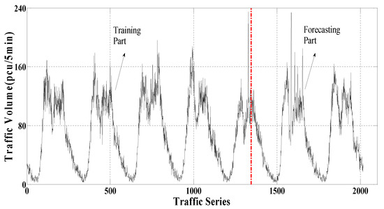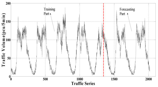 The data collection A (including 2016 samples) was measured from the intersection entrance A of an arterial road in the main urban area of Chongqing and the location is shown in Figure 2. The statistical interval was 5 min, as shown in Figure 3. Two-thirds of the data were used to train the model, and the rest were used to test the performance of the built model. Table 1 summarizes the characteristics of data collection A. It could be observed that this dataset had strong volatility.