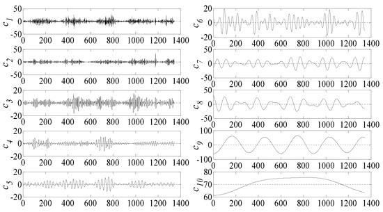According to the forecasting process of the proposed model in Section 2.3, TVF-EMD is used to decompose the experimental data A into 10 subsequences, as shown in Figure 4.
