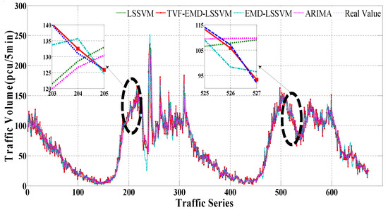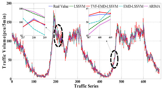 To further enhance the accuracy of the traffic volume prediction, it is necessary to find new methods to deal with short-term traffic volume data. This paper proposes a novel time varying filtering based empirical mode decomposition (TVF-EMD) algorithm, which vividly describes the time-varying characteristics of data and overcomes the occurrence of mode mixing [27]. Specifically, TVF-EMD is firstly adopted to decompose the short-term traffic volume data and obtain multiple subsequences. Secondly, the LSSVM model is adopted for each subsequence to perform the final prediction. On this basis, five evaluation indexes including the mean absolute error, mean relative percentage error, root mean square error, root mean square relative error and equal coefficient are used to systematically evaluate the forecasting results. Meanwhile, the comparison of the proposed method with other forecasting models including EMD-LSSVM, LSSVM, and ARIMA is conducted. Finally, some conclusions are provided.