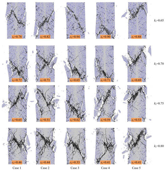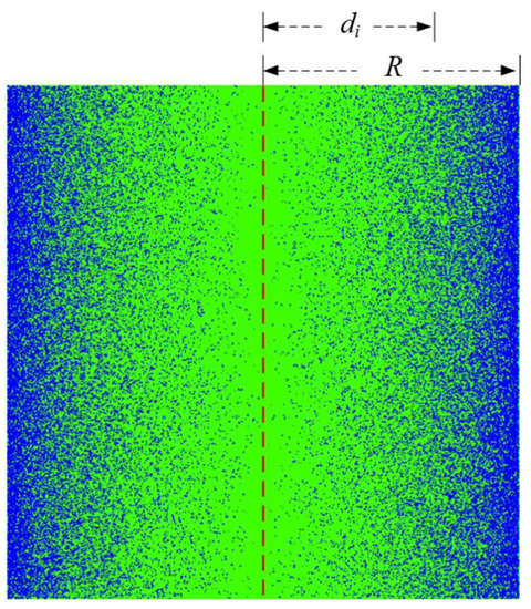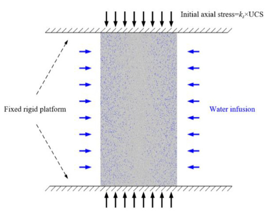 - Build the model with the dimension of 50 × 100 mm. We set PWC contacts randomly distributed in the model to simulate the cement in coal. The maximum water content of the coal specimen is 0.17, and the total number of contacts in the model is 54,945. Accordingly, the number of PWC is 9341;