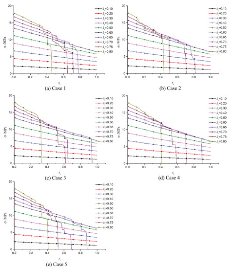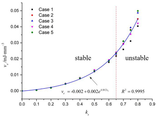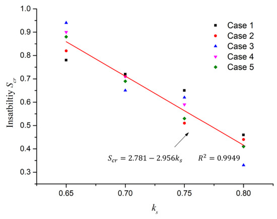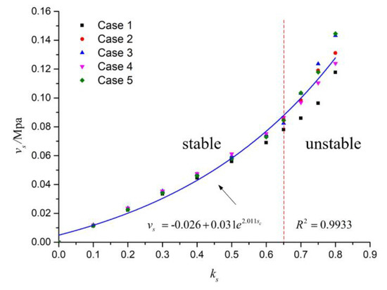 - When ks exceeds 0.65, the stress drops abruptly. With the increase of ks, the critical instability water saturation coefficient decreases. This means that under such geo-stresses, the coal pillar is unstable and easier to be failed by water infusion.