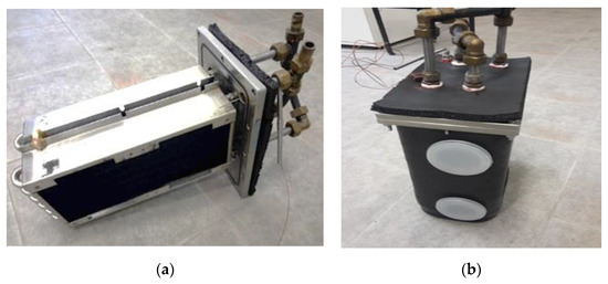 For the phase changer, an existing condenser/evaporator, already developed at ITAE for mobile applications, was used. It is made up of two highly efficient commercial heat exchangers, represented in Figure 2. They have copper fins and stainless steel tubes, to avoid corrosion issues when in direct contact with liquid water. Each heat exchanger has a surface area on the fin side of 0.988 m2; the tube side has a 0.078 m2 thermal contact area; and the fin density is 16 FPI (fins per inch). The exchangers were connected in parallel by means of a hydraulic circuit made with steel pipes and compression fittings on the outside of the vacuum chamber. The vacuum chamber, in which the heat exchanger has been placed, is made of AISI 316 stainless steel and is equipped with vacuum flanges for the connections of all the relevant equipment.