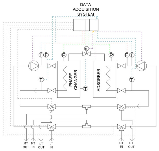 The test is performed as follows: after all the set levels of temperature have been defined, the adsorption cycles are started and oscillation in temperatures is monitored. Once a steady-state condition has been reached, a record is started and all the energy flows are measured for 1 h or 6 cycles (for the longest cycle times), by evaluating the thermal power exchanged across each adsorption machine component. The last three cycles are then analyzed for performance evaluation.