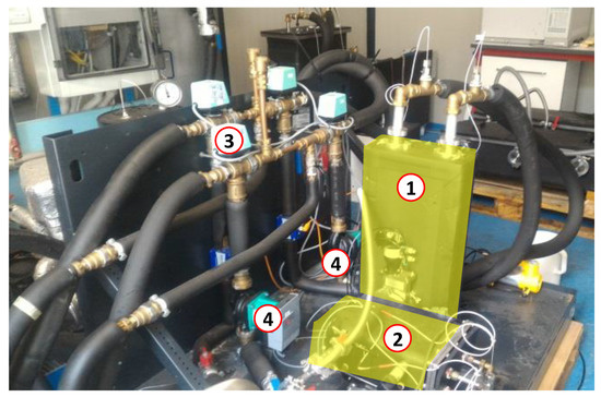 The cold storage prototype (highlighted) connected to the testing bench. (1) composite adsorber based on an aluminum, porous structure and a SAPO-34 coating; (2) phase-changer; (3) switching valves; (4) pumps.