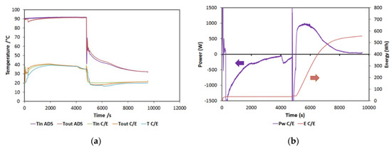 In this section, a typical test will be briefly discussed. In Figure 5a, the typical trends of the temperatures in the components are reported for a 90/38/20 (HT/MT/LT) test. They are consistent with the operation of typical sorption storage: during the first half of the cycle, the adsorber is heated, while the condenser is cooled down. Both the temperatures are constant, indicating a good capacity of the testing bench in terms of maintaining the set conditions. During the second part of the cycle, the useful effect is visualized by the reduction in the temperature at the evaporator (the blue line in the figure), while the adsorber is cooled. During the tests, the same temperature was used both for condensation and for adsorption (three temperature levels).