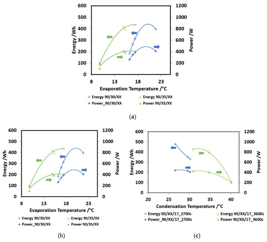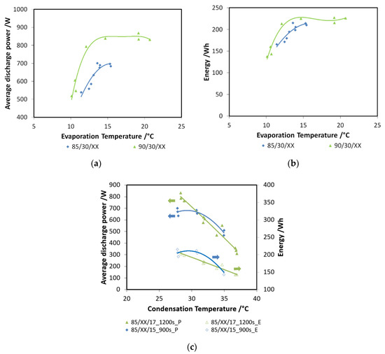 The effect of condensation temperature is summarized in Figure 8c: both the recovered energy (e.g., 85/XX/17_1200s_E) and discharged power (e.g., 85/XX/17_1200s_P) decrease for higher condensation temperatures. The effect is more marked for the lower evaporation temperatures, corresponding to a higher pressure lift between the evaporator and the condenser.