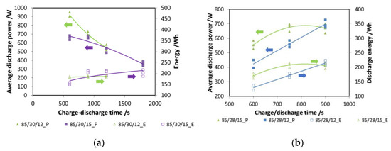 In Figure 7a, tests with two different evaporation temperatures (12 °C and 15 °C) and different cycle times are presented. In particular, for the tests here shown, the durations of charge and discharge are the same. The results are presented both in terms of energy (e.g., 85/30/12_E) and power (e.g., 85/30/12_P): as expected, power decreases with increasing cycle time. However, energy, once 900 s of charge/discharge time is reached, has a plateau, indicating that this is the optimal choice.