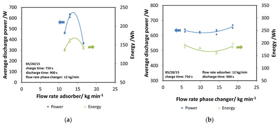 Subsequently, the effect of the flow rate in the two components has been evaluated, since it represents a key design parameter. In Figure 9a, the effect of the flow rate in the adsorber has been evaluated, considering both the discharge power and energy. The trend obtained is clear: there is an optimum value of flow rate allowing the maximizing of the performance of the system, which is 12 kg/min. Indeed, lower flow rates probably worsen the heat transfer inside the heat exchanger of the adsorber, while higher flow rates are as detrimental. Moreover, they lead to very a small temperature difference that might negatively affect the practical application. Therefore, the value of 12 kg/min has been considered for all the other tests.