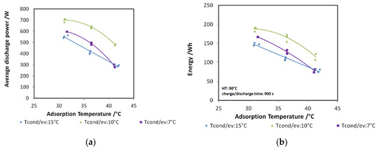 The results of the analysis are shown in Figure 10a,b for discharge power and stored energy, respectively. The performance indicators are represented as a function of adsorption temperature. In particular, three different evaporation/condensation temperatures have been tested (7, 10, and 15 °C), and for each of them, three different adsorption temperatures (30, 35, and 40 °C). The tendency reported in the graphs is clear: there is a benefit in realizing the charge of the system at a lower temperature with respect to adsorption temperature.