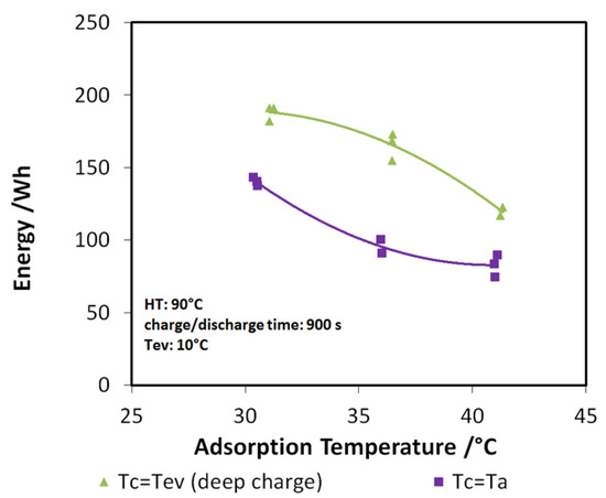 Indeed, the lower the difference between adsorption and condensation temperature, the higher the discharge power and energy recovered, especially when the useful effect has to be provided at 7 or 10 °C. The findings described here are further highlighted in Figure 11, where the case of a 10 °C evaporation temperature has been considered. The green points represent the tests with “deep charge,” while the purple line represents the tests in which the condensation and adsorption temperatures are equal (“normal charge”). It is possible to see that, for the three adsorption temperatures tested (3T), an increase of about 20%–25% in the stored energy is achieved by means of deep charge.