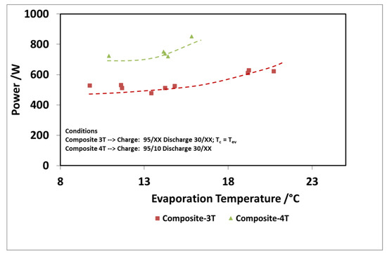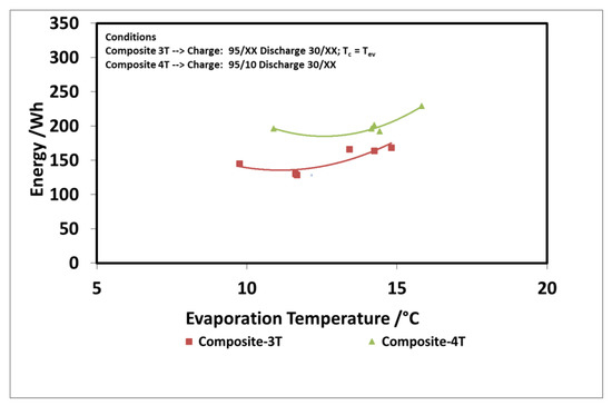 The results of the evaluation are summarized in Figure 12 and Figure 13 for the discharge power and stored energy for different evaporation temperatures and a driving temperature of 95 °C. As suggested by the results on “deep charge” tests, by making the cold storage work at four different temperature levels, there is a benefit; that is, higher evaporation temperatures. In this case, indeed, the difference in the uptake exchanged during charge in three temperature and four temperature tests is higher because the difference between the condensation temperatures in the two types of tests is higher.