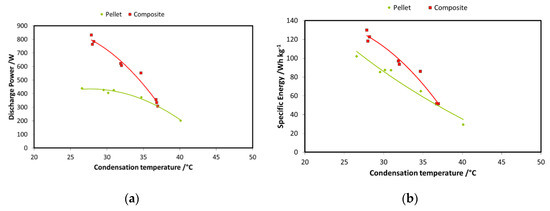 A second step in the comparison between the two systems is reported in Figure 15a,b, wherein the discharge power and recovered energy for the two adsorbers are shown. The boundary conditions used are: 85 °C driving temperature; 15 °C evaporation temperature; and 3600 s charge/discharge time for the pellets adsorber and 900 s for the composite adsorber. Results are displayed as a function of condensation temperature. The results for the energy comparison make use of the specific energy; they are normalized for the masses of the adsorbent materials in the two exchangers. There is a relevant difference in the discharge power achievable with the two technologies: as previously stated, average power during each cycle is much higher in the case of the composite adsorber, about double that of the pellets heat exchanger. The results in terms of specific energy stored do not show the same marked difference; there is only a low increase for the composite technology. However, the results regarding composite heat exchanger probably should take into account the effect of the mass of aluminum composite inside the exchanger.