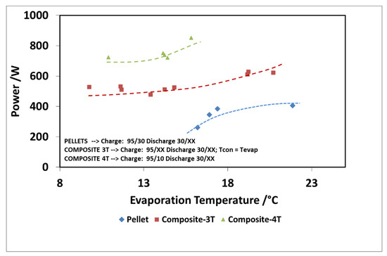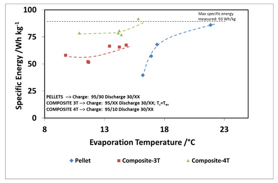 Finally, Figure 16 and Figure 17 show the comparison as a function of evaporation temperature, by considering the operation of the composite adsorber as well, in the best performing configuration, with four temperature levels. In addition, in this case, the results in terms of stored energy are normalized for the mass of adsorbent inside the storage. By considering these conditions, the effect of composite technology is to increase the achievable discharge power by about 60%, especially for higher evaporation temperatures. The maximum specific energy measured in both the pellet and composite adsorber was around 90 Wh/kg, but in the case of the composite adsorber, this result was achieved for an evaporation temperature of 15 °C, whereas for the pellet adsorber this was obtained for an evaporation temperature of 22 °C.