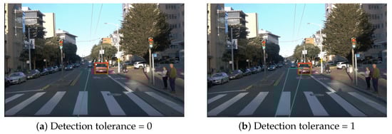Examples of two different detection tolerances applied to the same scenario, displayed on visualizations of camera images in the Waymo Open Dataset.